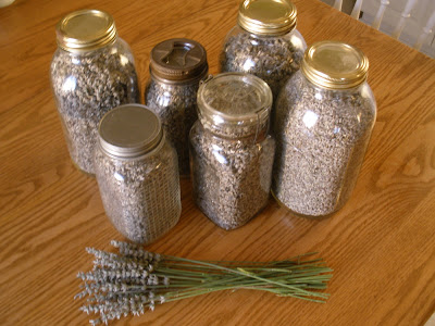 This year I filled two 2 quart and three quart canning jars. Pictured are the combined six jars. My plan is to make lavender water, lavender sachets and essence of lavender with the buds.